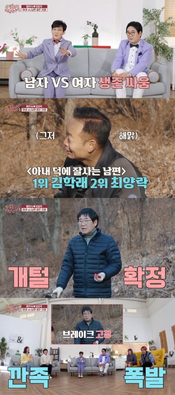 특히 김학래는 혹시라도 명품 옷이 더러워질까봐 걱정만 털어놨고, 이를 본 최양락은 답답함에 "뭐라도 하라"고 다그쳤다. 보다 못한 팽현숙이 다가와 음식 재료 찾는 법을 알려줬지만, 김학래는 "통계가 나왔다. 아내 덕에 잘 사는 사람들 2위가 최양락, 1위가 나다"라는 철없는 소리를 해 웃음을 자아냈다.