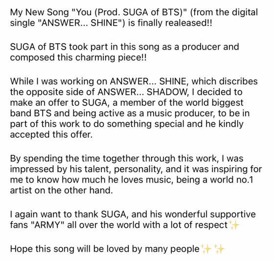 지난 10월 15일 공개된 ØMI의 'You (Prod. SUGA of BTS)'는 12월 31일(한국시간) 스포티파이 700만 스프리밍을 넘어섰다. ØMI의 'You (Prod. SUGA of BTS)'는 슈가가 프로듀싱과 작곡에 참했다.