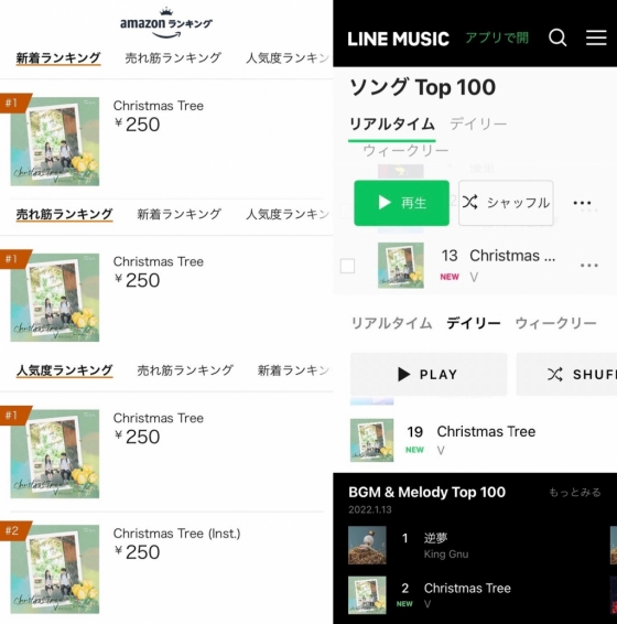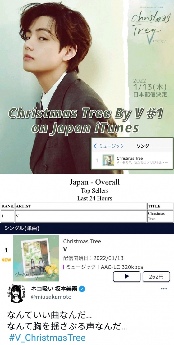 방탄소년단(BTS) 뷔의 'Christmas Tree'가 일본 아이튠즈 톱 송 차트, 아마존 등 각종 음원 사이트에서 1위를 차지하며 막강한 일본 인기를 과시했다.