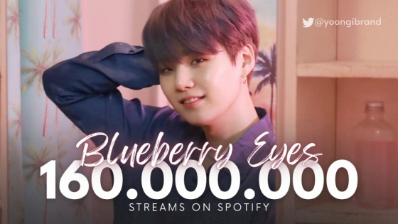 방탄소년단(BTS) 슈가가 피처링 참여한 팝가수 맥스(MAX)의 'Blueberry Eyes (feat. SUGA of BTS)'가 스포티파이(Spotify)에서 1억 6000만 스트리밍을 달성했다.