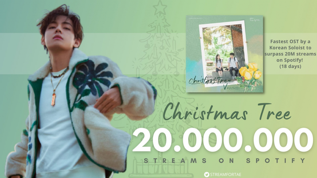 방탄소년단(BTS) 뷔의 'Christmas Tree'가 세계 최대 음원 플랫폼 스포티파이에서 K팝 남자 솔로아티스트 중 최단시간에 2000만 스트리밍을 돌파했다.