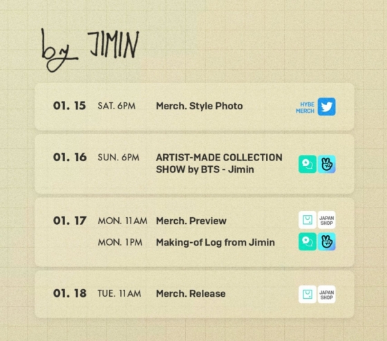 방탄소년단은 각자의 취향을 담아 팬들과 함께 사용하고 싶은 아이템들을 만들어 순차적으로 공개, 판매하고 있으며 지민은 오는 15일 스타일 포토를 시작으로 프리뷰와 메이킹 로그 등에 이어 18일 오전 11시 정식 판매될 예정으로 기다리는 팬들을 애태우고 있다.