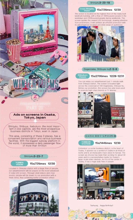매해 놀라운 서포트로 전세계를 놀라게 하는 뷔의 중국 팬클럽 '바이두 뷔바'는 도쿄와 오사카의 대형 스크린에 생일 축하 영상을 송출했다.
