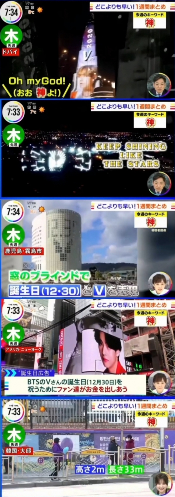 일본 민영방송 TBS의 'THE TIME'은 뷔의 초특급 글로벌 생일 이벤트에 주목해 뉴욕 타임 스퀘어 대형 비전의 생일 광고와 베트남 거대 관람차의 생일 메세지 송출 등을 소개했다.