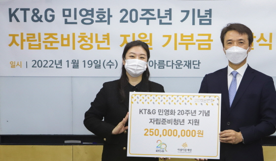 KT&G가 서울시 종로구에 위치한 아름다운재단 대회의실에서 자립준비청년 지원을 위한 기부금 전달식을 진행하고 후원금 2억5,000만원을 19일 전달했다.