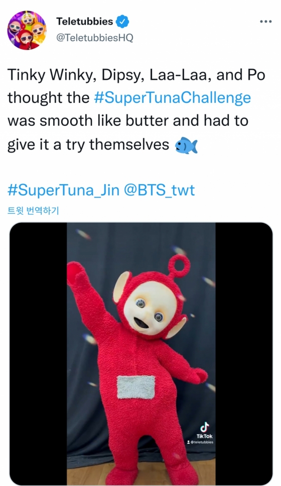 방탄소년단(BTS) 진의 자작곡 '슈퍼 참치'의 전 세계적 신드롬에 '텔레토비'까지 뛰어들었다.