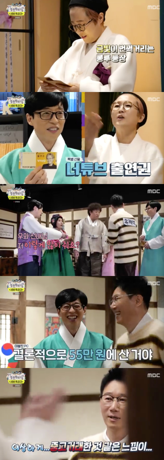 멤버들은 송은이에 세배를 하며 감사한 마음을 전했고, 송은이는 멤버들과 맞절을 한 뒤 준비한 게 있다며 금빛 봉투를 꺼내들어 눈길을 모았다. 신봉선과 미주는 봉투를 열어보곤 "헉"하며 깜짝 놀랐다. 진짜 세뱃돈이 들어 있던 것. 하지만 정준하와 유재석은 갸우뚱하며 시선을 떼지 못했다. 송은이가 유재석에게는 유튜브 출연권, 정준하에게는 행운권을 넣었던 것. 송은이는 정준하에 "이제 저보다 오빠가 별로 없다. 건강하셨으면"이라고 설명해 웃음을 더했다.