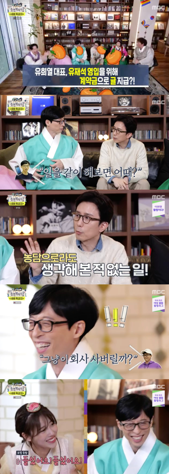 유재석은 또한 계약금을 받지 않고 입사하겠다고 말했다는 사실을 전했고, 유희열은 이에 "근데 내가 반대했다. 유재석이라는 인물이 가지고 있는 상징성이 있다. 야구선수로 치면 대한민국 최고 4번 타자인데 그런 사람이 계약금 없이 입사를 하는 예는 만들면 안 된다"고 설명해 감동을 안겼다. 유희열은 "그래서 반대했더니 '그렇겠지?'하더라"며 어이없어 했고, 유재석이 늘 몇 수를 내다본다고 한탄해 웃음을 더했다.