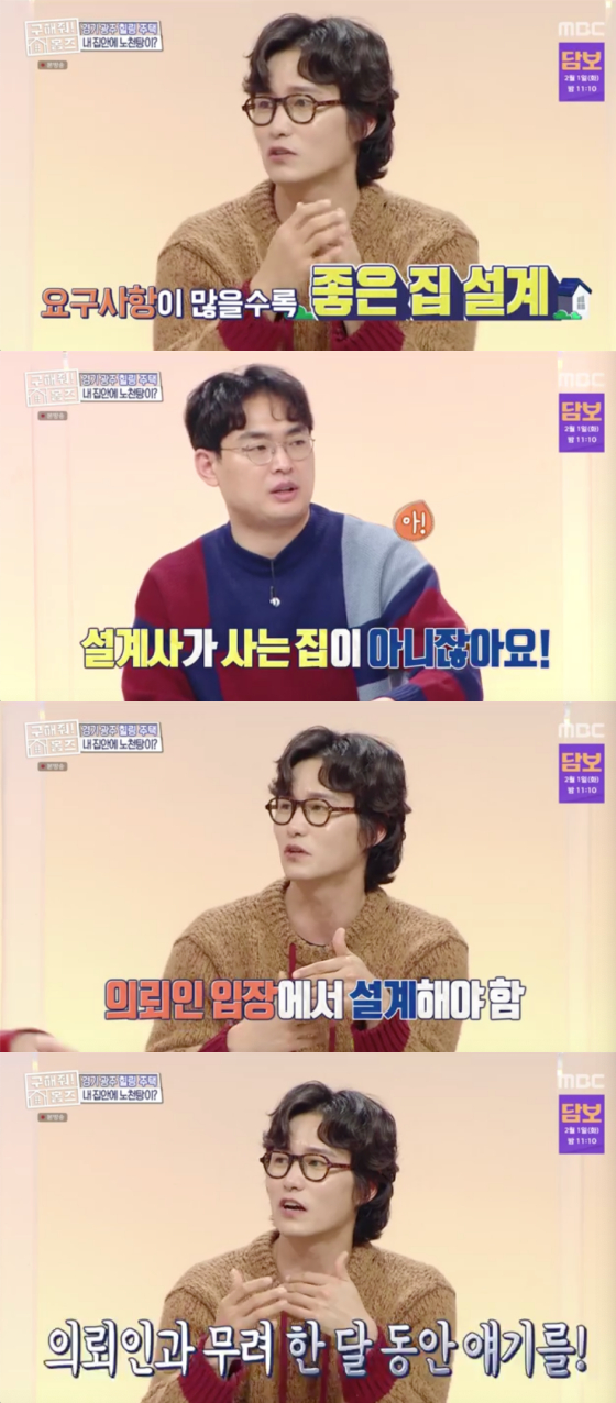 이날 박영진은 임성빈에 그간 궁금했다며 "설계를 의뢰할 때 구체적으로 찝어주는 게 좋냐, 밑고 맡기는 게 좋냐"고 질문했다. 임성빈은 "많이 요구할수록 좋은 집이 나올 수밖에 없다. 설계사가 사는 집이 아니라 의뢰인이 사는 집이지 않냐. 최대한 역지사지로 설계해야 좋은 집이 나온다"고 답해 눈길을 모았다.