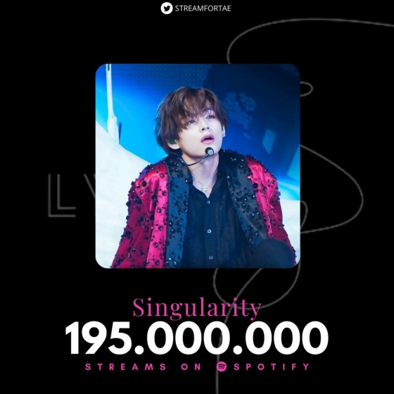 톱 아이돌그룹 방탄소년단(BTS, RM 진 지민 제이홉 슈가 뷔 정국) 멤버 뷔 솔로곡 '싱귤래리티'(Singularity)가 스포티파이 스트리밍 1억 9500만을 돌파하며 2억 스트리밍에 한발 더 다가섰다.