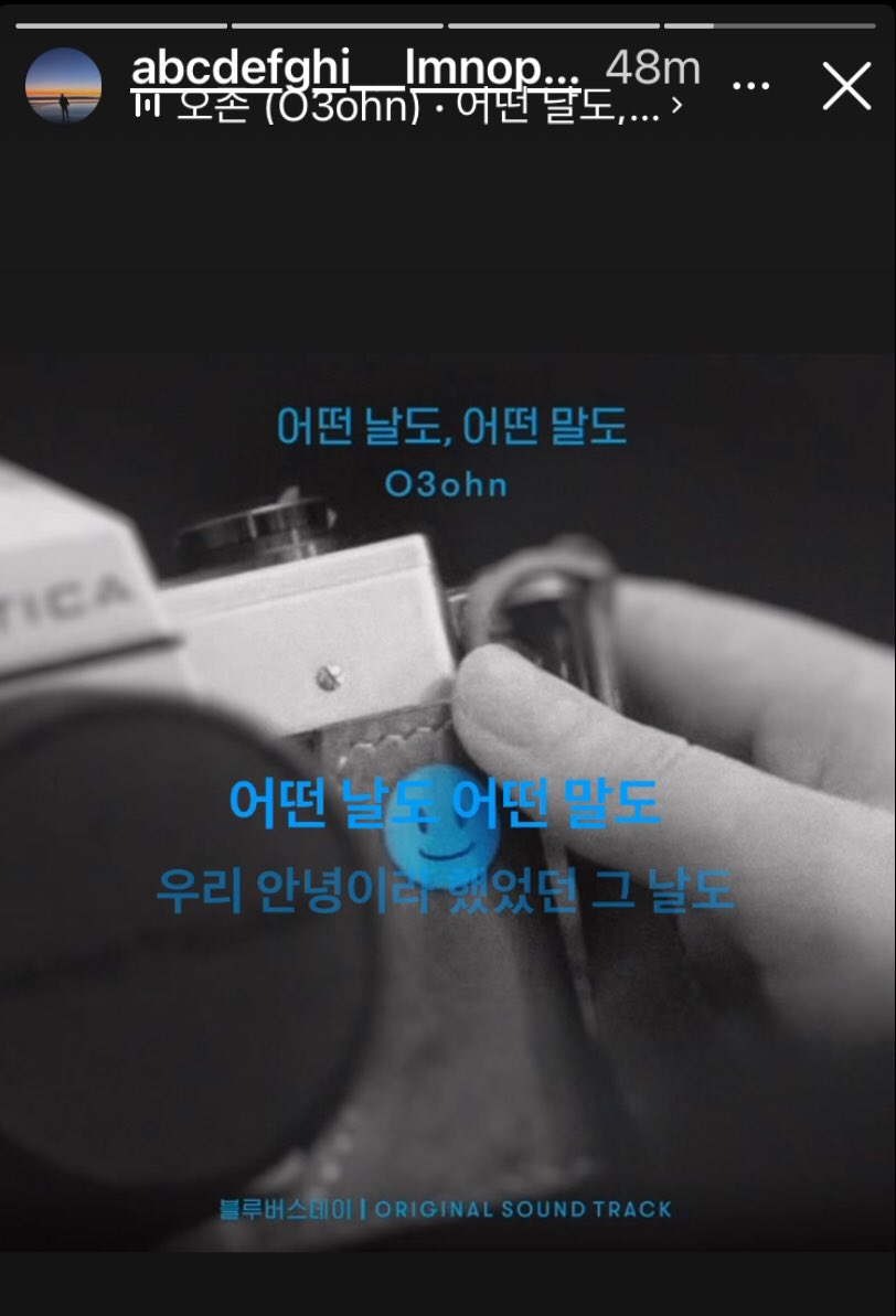 정국은 지난 7일 자신의 인스타그램스토리를 통해 '블루버스데이' OST인 싱어송라이터 오존(O3ohn)의 '어떤 날도, 어떤 말도' 라는 곡을 전세계 팬들에게 공유하며 추천했다.