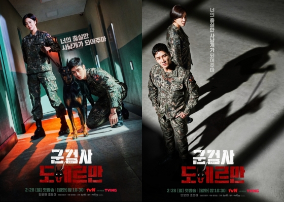 8일 tvN 새 드라마 '군검사 도베르만'(극본 윤현호, 연출 진창규) 측은 짜릿한 밀리터리 법정 활극의 탄생을 예감케 하는 메인 포스터 2종을 공개, 시선을 압도하는 두 사람의 범접 불가 아우라가 지금까지와는 다른 새로운 연기 변신을 기대케 하는 동시에 이제껏 접해보지 못했던 밀리터리 법정 활극의 탄생을 예고한다.