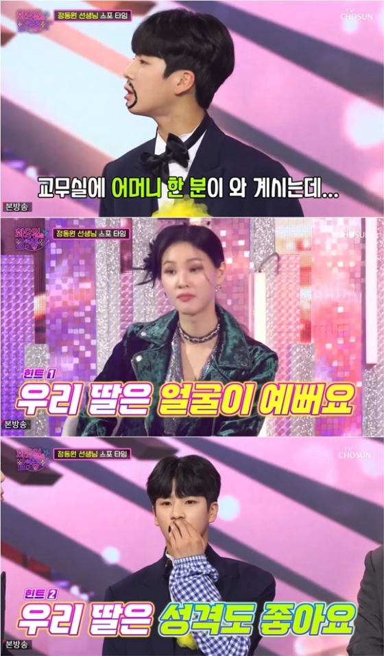 정동원은 "내가 왜 나왔냐면 교무실에 어머니가 한 분 나와계시는데, 얼굴도 예쁘고 성격도 좋고 노래도 아주 잘 하는 딸을 만나러 왔다고 계속 기다리고 계신다"며 정보를 전하곤 다시 무대 뒤로 사라졌다.