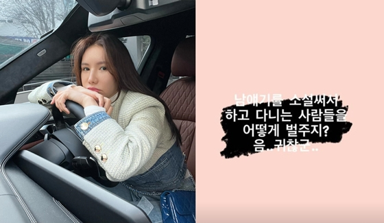 정아는 지난 17일 자신의 인스타그램 스토리에 "남 얘기를 소설 써서 하고 다니는 사람들을 어떻게 벌주지? 음. 귀찮군"이라는 글이 담긴 사진을 게재했다.