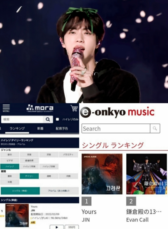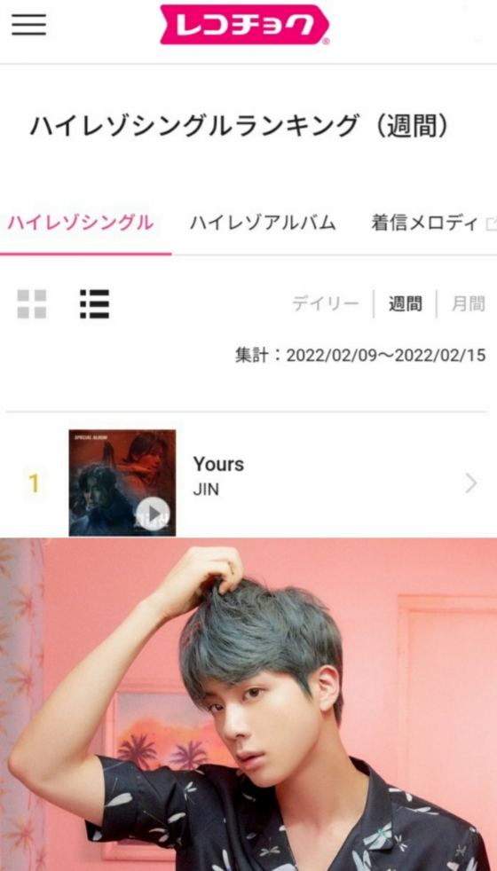 진의 'Yours'(High-resolution)는 일본 음원 사이트 '레코초쿠'(recochoku) High-resolution 주간 차트 1위에 오르며 폭발적인 음원 파워를 과시했다.