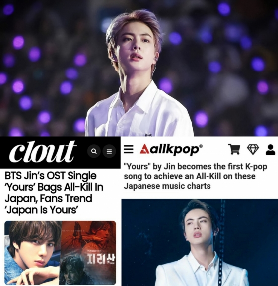 이에 미국 올케이팝(Allkpop)은 '방탄소년단 진의 'Yours'는 일본 음악 차트에서 올킬을 달성한 최초의 K팝'이라는 기사를 통해 진의 아티스트로서의 뛰어난 역량과 막강한 음원파워를 집중 조명, 진의 보컬이 가진 다른 차원의 아름다움과 높은 전문성에 놀라움을 나타냈다.