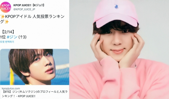 일본에서 고유한 맑은 미성으로 '크리스탈 보이스'라고 불리며 큰 사랑을 받고 있는 글로벌 슈퍼스타 진은 일본 '케이팝 주스' (KPOP JUICE)' 아이돌 인기랭킹 데일리 투표 1위에 오르는 등 극강의 인기를 빛냈다.