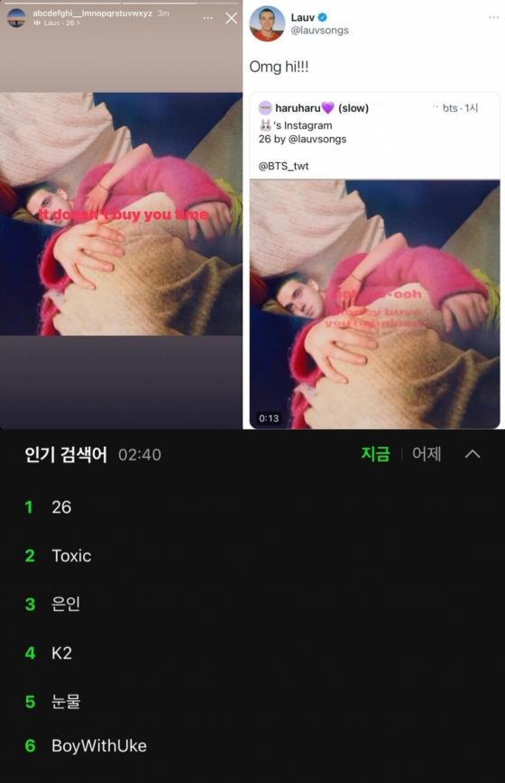 이날 정국은 미국 싱어송라이터 가수 라우브(Lauv)의 '26'을 팬들에게 추천했다.