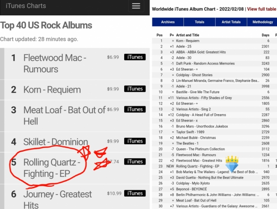 지난 8일 발매된 롤링쿼츠 첫 미니앨범 '화이팅(Fighting)'은 발매와 함께 월드 와이드 아이튠즈 앨범 차트에 23위로 데뷔했으며 미국 록 앨범 차트에서는 5위로 진입했다.