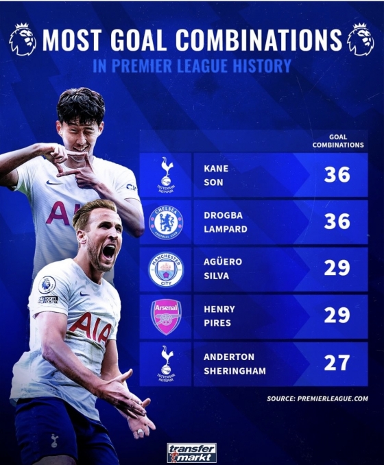 이날 득점으로 손흥민-케인 듀오는 첼시 전설 프랭크 램파드-디디에 드로그바 듀오와 어깨를 나란히 했다. 램파드와 드로그바는 2004년부터 2012년까지 8년간 호흡하며 36골을 만들었다. 손흥민과 케인은 36골을 합작하는 데 약 7년 반이 걸렸다. 지난 시즌에만 14골을 함께 만들며 무르익은 호흡을 자랑했다.