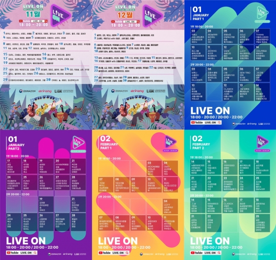 아리랑TV와 한국음악레이블산업협회(음레협)가 함께 추진한 문화체육관광부 소규모 대중음악공연 지원사업 'LIVE. ON'은 코로나19 장기화로 어려움을 겪고 있는 소규모 대중음악 공연장과 뮤지션을 지원해 대중음악공연 분야의 지속 가능성을 높이고자 추진됐다. 지난해 11월 1일부터 약 4개월 동안 대중음악 뮤지션 450여 팀이 'LIVE. ON'에 참여해 소규모 및 온라인 공연으로 음악팬들과 만났다.