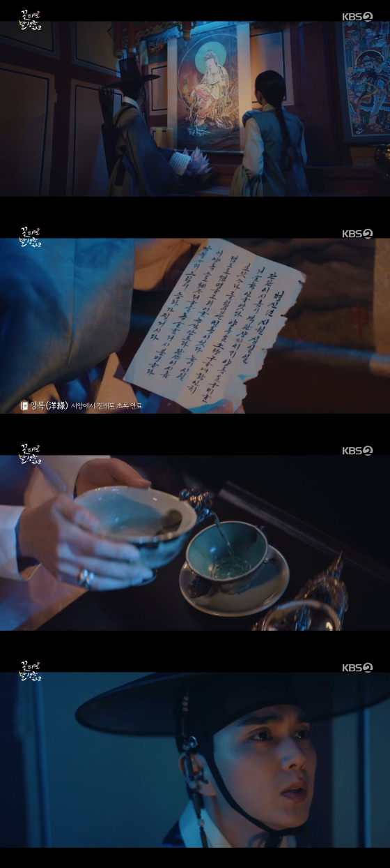 앞서 강로서는 남영과 함께 자신의 아버지가 남영을 구했던 사찰을 방문했다. 강로서는 "여기였소? 우리 아버지가 뒷방 도령을 살린 곳이"라고 물었다. 남영은 "여기었소"라고 했다. 강로서는 "아버지는 뭘 확인하려고 여기 오셨던 걸까요"라고 궁금해했다.