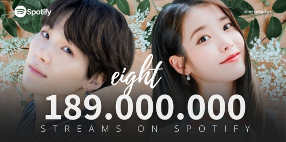 방탄소년단 슈가(BTS SUGA)가 프로듀싱한 아이유(IU)와 컬래버레이션곡 '에잇(Prod.&Feat. SUGA of BTS)' 스포티파이 1억 8900만 스트리밍을 돌파하며 인기를 이어갔다.