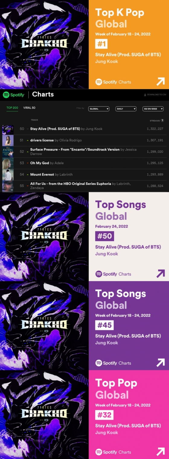 정국이 부르고 슈가가 프로듀싱한 웹툰 '세븐페이츠: 착호(7FATES: CHAKHO)' OST 'Stay Alive (Prod. SUGA of BTS)'는 2월 18일~24일 자 스포티파이 톱 K팝 글로벌 주간 차트에서 2주 연속 1위를 차지했다.