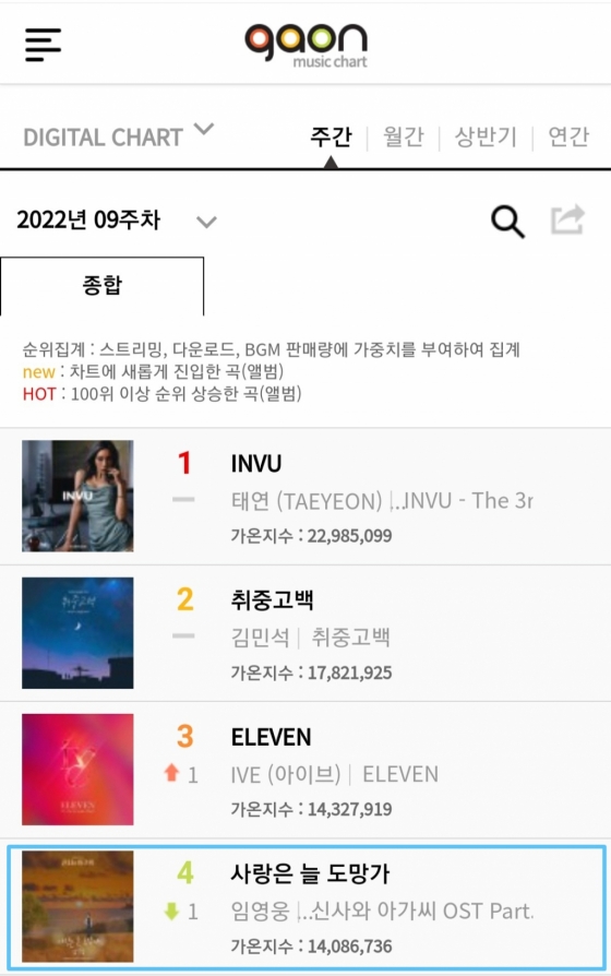 가수 임영웅의 '사랑은 늘 도망가'가 가온 디지털 차트 주간 톱4에 오르며 인기를 빛냈다.