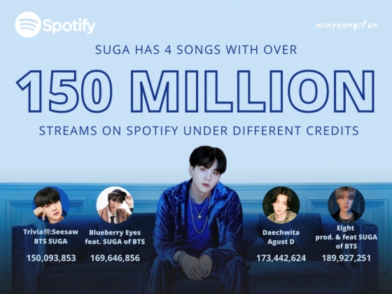 슈가는 이로써 스포티파이에서 네 번째 1억 5000만 돌파 기록을 세우게 됐다.