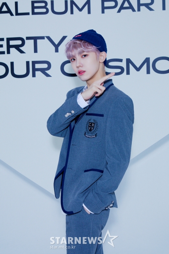 그룹 크래비티(CRAVITY) 성민이 22일 오후 온라인 생중계로 진행된 정규앨범 파트 2 'LIBERTY: IN OUR COSMOS'(리버티: 인 아워 코스모스) 발매기념 기자간담회에 앞서 포즈를 취하고 있다.