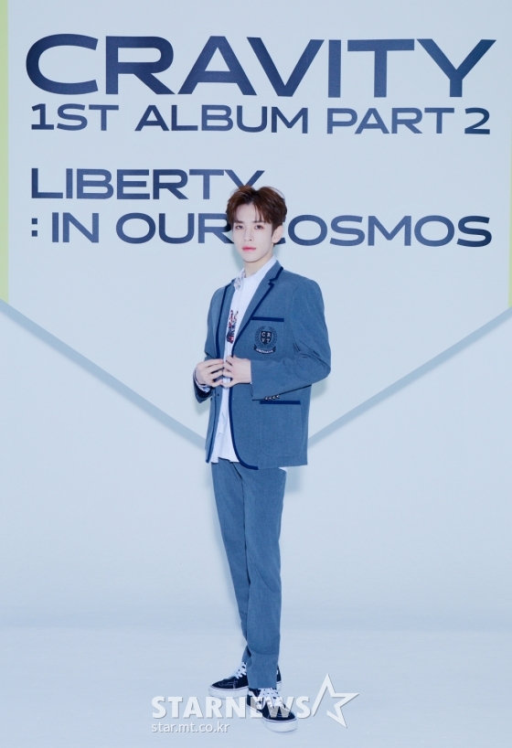 그룹 크래비티(CRAVITY) 앨런이 22일 오후 온라인 생중계로 진행된 정규앨범 파트 2 'LIBERTY: IN OUR COSMOS'(리버티: 인 아워 코스모스) 발매기념 기자간담회에 앞서 포즈를 취하고 있다.