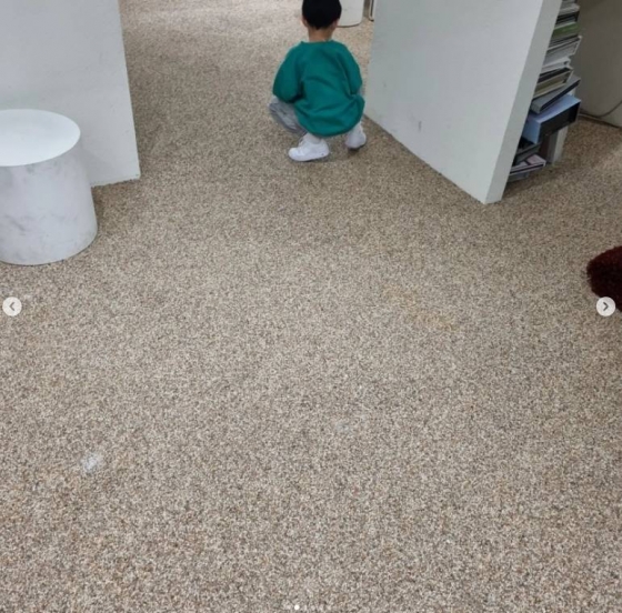 사진 속에는 정주리의 8세 첫째 아들 도윤 군이 정주리 남편의 사무실에 떨어진 자신의 이를 찾는 모습. 그러나 사무실 바닥은 얼룩무늬가 많아 이를 찾기 어려워 보였다.