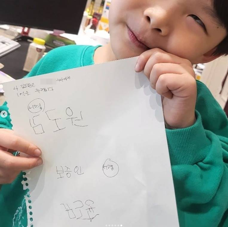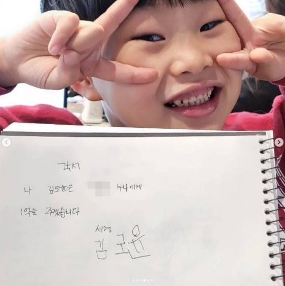 또 다른 사진에선 도윤 군과 6세 둘째 아들 도원 군이 정주리 남편의 사무실에서 일하는 직원에게 자신의 잃어버린 이를 찾아주면 1억 원을 주겠다는 내용의 각서를 쓴 모습이 담겨 있었다.