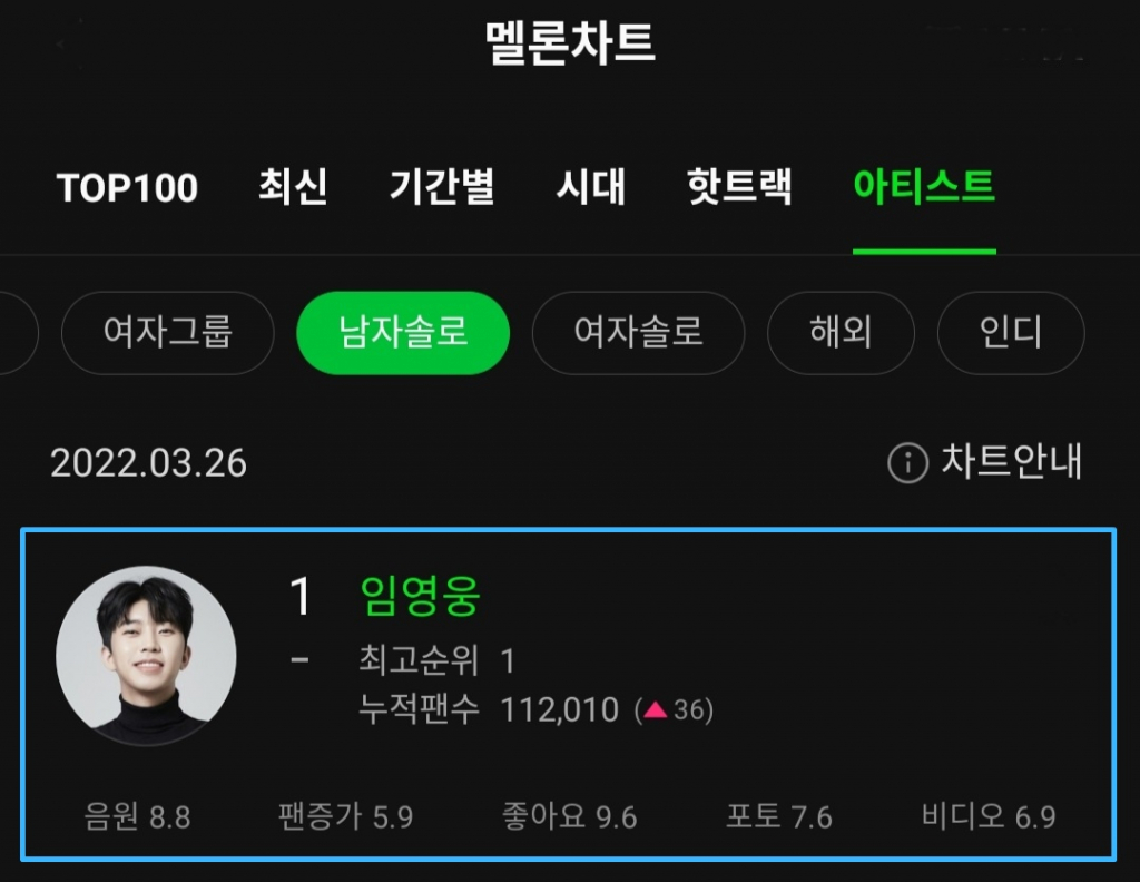 임영웅은 3월 26일 기준 멜론차트 아트스트 차트 남자솔로 1위를 기록했다.