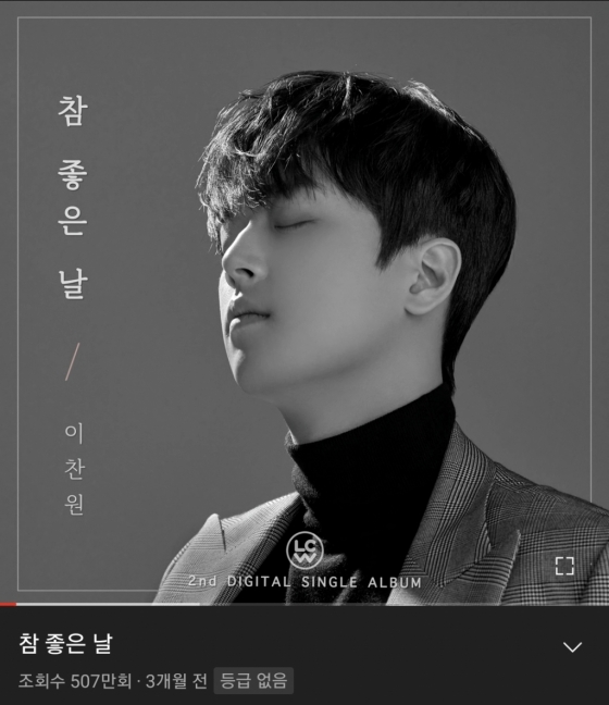 이찬원이 지난해 12월 9일 공식 유튜브 채널에 공개한 '참 좋은 날' 음원 영상은 3월 31일 조회수 500만 뷰를 넘어섰다. 지난 3일 400만 뷰 돌파 후 28일 만에 또 의미 있는 기록을 세웠다.