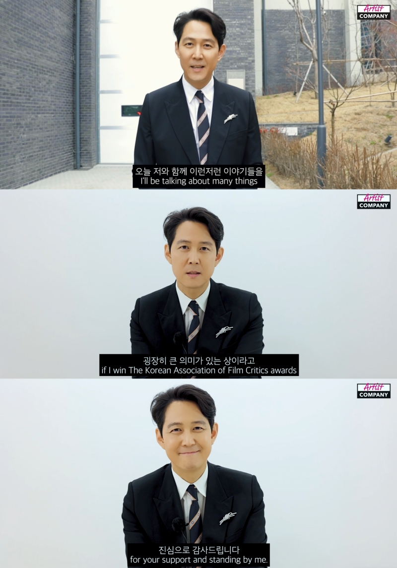 이정재는 최근 소속사 아티스트컴퍼니 공식 유튜브 채널을 통해 인터뷰를 공개했다. 이정재는 넷플릭스 시리즈 '오징어 게임'을 통해 미국배우조합상(SAG), 크리틱스 초이스 어워즈, 인디펜던트 스피릿 어워즈, 크리틱스 초이스 슈퍼 어워즈 등에서 아시아 배우 최초로 남자 배우상을 수상하며 새로운 기록을 연이어 쓰고 있다.