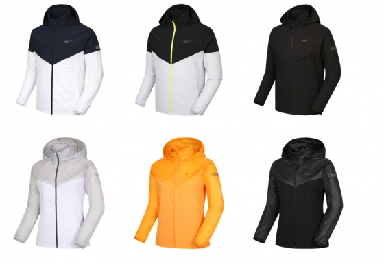 먼저, 바람막이 자켓으로 '스피드라인 바람막이 자켓'이 있다. 이 제품은 가슴과 등 부분에 메쉬 소재를 적용해 우수한 통풍성과 쾌적한 착용감을 자랑한다. 시그니처 V라인을 강조한 디자인이 돋보이며, 필요에 따라 후드를 꺼내 입거나 넣어 입을 수 있어 편리하다. 남성용은 화이트, 그레이, 블랙으로, 여성용은 화이트, 오렌지, 블랙으로 출시됐다.