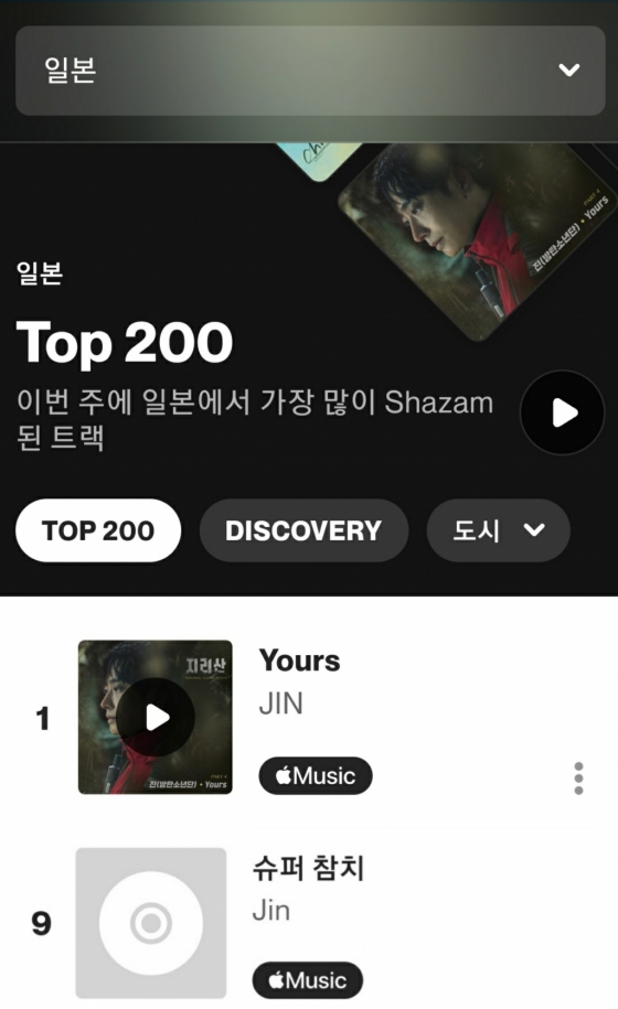 방탄소년단(BTS) 진의 'Yours'가 샤잠 일본 TOP 200 1위에 오르며 꾸준한 인기를 증명했다.