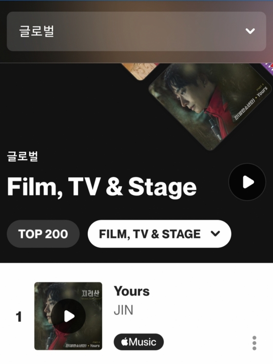 진의 'Yours'는 샤잠의 '글로벌 TOP 200' 차트 'Film, TV & Stage' 부문에서도 압도적인 대기록을 세웠다.