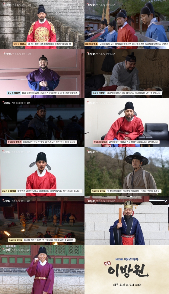 KBS 1TV 대하드라마 '태종 이방원'(연출 김형일, 심재현/ 극본 이정우/ 제작 몬스터유니온) 제작진은 완벽한 열연으로 극을 더욱 풍성하게 만든 조연들의 인터뷰와 가장 기억에 남는 명장면을 공개해 눈길을 끈다.