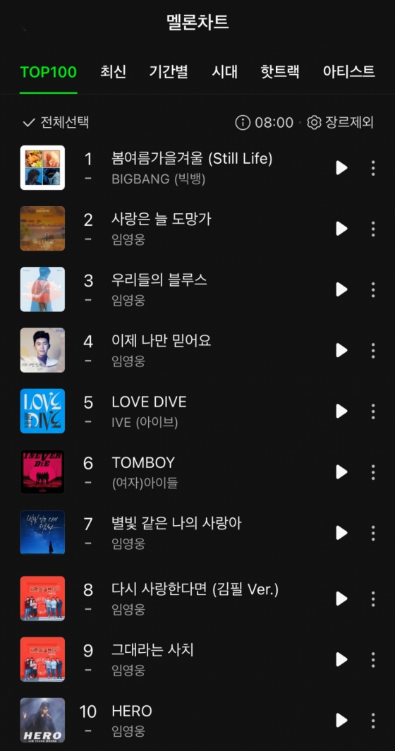 임영웅은 4월 24일 오전 8시 기준 멜론 메인 차트인 멜론 TOP100 톱10을 석권했다.