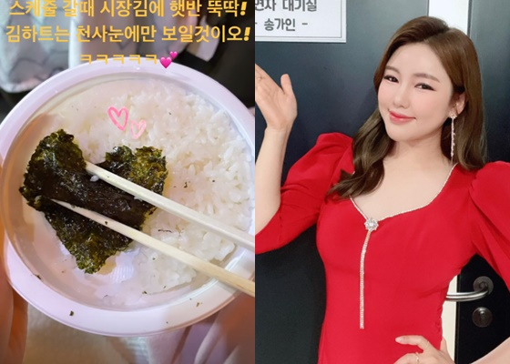 송가인은 24일 오후 자신의 인스타그램에 "스케줄 갈 때 시장 김에 햇반 뚝딱. 김하트는 천사 눈에만 보일 것이오"라는 글과 사진을 게재했다.