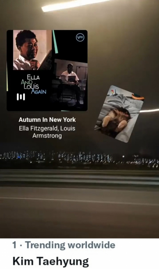 이어 서울도심의 야경을 배경으로 루이암스트롱과 엘라 피츠제랄드의 '오텀 인 뉴욕' 재즈가 흘러나오는 영상에서는 뷔의 반려견 연탄이의 사진이 함께 공개돼 팬들을 즐겁게 했다.