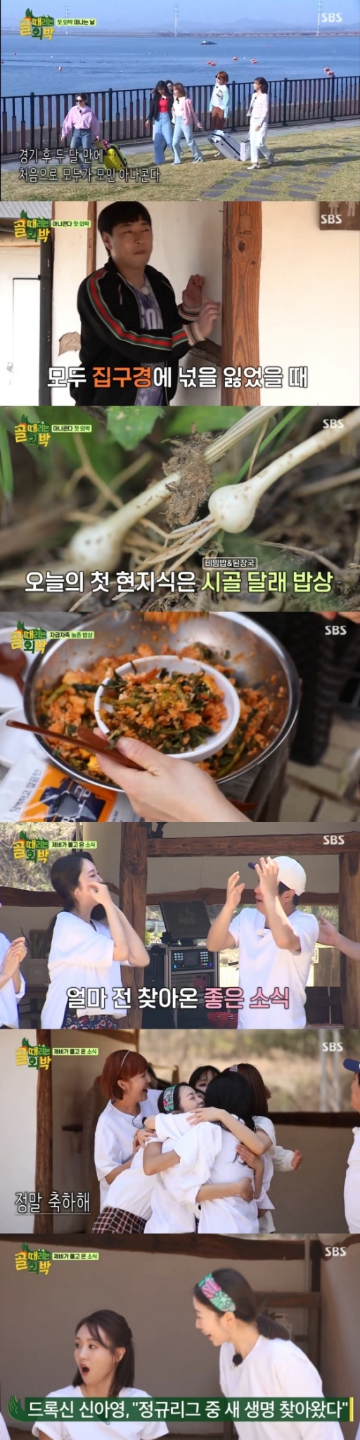 막걸리까지 기울이며 한껏 분위기가 고조된 가운데, '엠티짱' 이수근은 갑자기 좋은 소식이 있다며 신아영의 임신소식을 알렸다. 멤버들은 깜짝 놀라며 신아영을 꼭 끌어안아줬다. 특히 신아영과 동갑내기인 윤태진은 "눈물이 날 것 같다"며 친구의 새로운 시작을 축복했다. 신아영은 "정규리그 중 임신했더라. 심지어 마지막 두 경기는 임신한 채로 뛰었다"며 "태명도 슈팅이. 축구를 하면서 찬스를 못 살린 게 계속 생각나더라. 그래서 아이는 기회를 놓치지 말라고 슈팅이라고 지었다"며 태명을 설명했다.