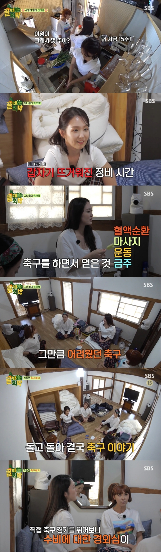 한편 최은경은 임신, 출산만큼 힘들었던 축구연습 과정을 언급하며 또다시 축구 이야기를 이어갔다. 최근 아들을 출산한 박은영 역시 적극 공감하며 "얼마 전 결혼식장에서 안정환님을 만났는데 물어보고 싶더라. 내 경기 보셨냐고. 왜 이렇게 (축구실력이) 안 느는 건지 묻고 싶었다"고 말했다. 또한 멤버들은 "축구를 하고나서 가장 달라진 점은 수비수에 대한 경외심. 스트라이커는 그저 만들어진 볼을 잘 처리하는 자리인 것 같다"며 기승전축구 이야기꽃을 피웠다. 프로그램 말미에는 고기를 놓고 내기게임을 하는 멤버들의 모습이 담겼다.