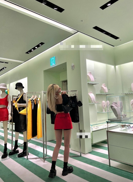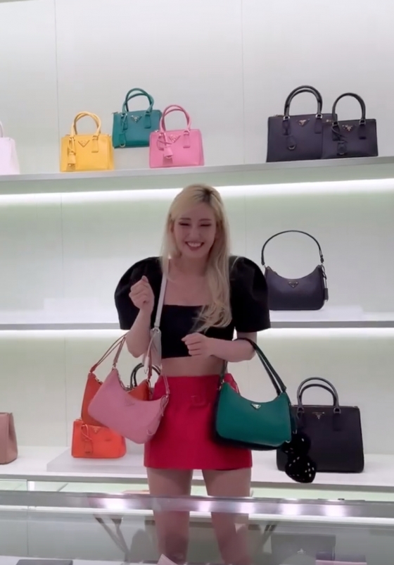사진에서 전소미는 가슴 부분이 푹 파인 블랙 컬러 크롭탑 상의와 레드 컬러 미니스커트를 입고 프라다 제품들을 바라보며 미소를 짓고 있다.