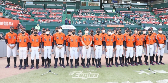 북일고 야구부가 31일 대전 NC전에서 앞서 애국가를 제창하고 있다. /사진=한화 이글스 제공