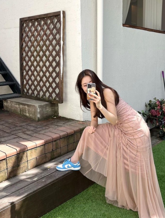 사진 속 경리는 핑크빛 원피스를 입고 포즈를 취한다. 특히 그의 완벽한 몸매와 더불어 어우러지는 분위기는 이목을 끈다. 또 다른 사진 속에선 운동화를 신고 역동적으로 사진 찍는 모습을 보여 웃음을 자아낸다.