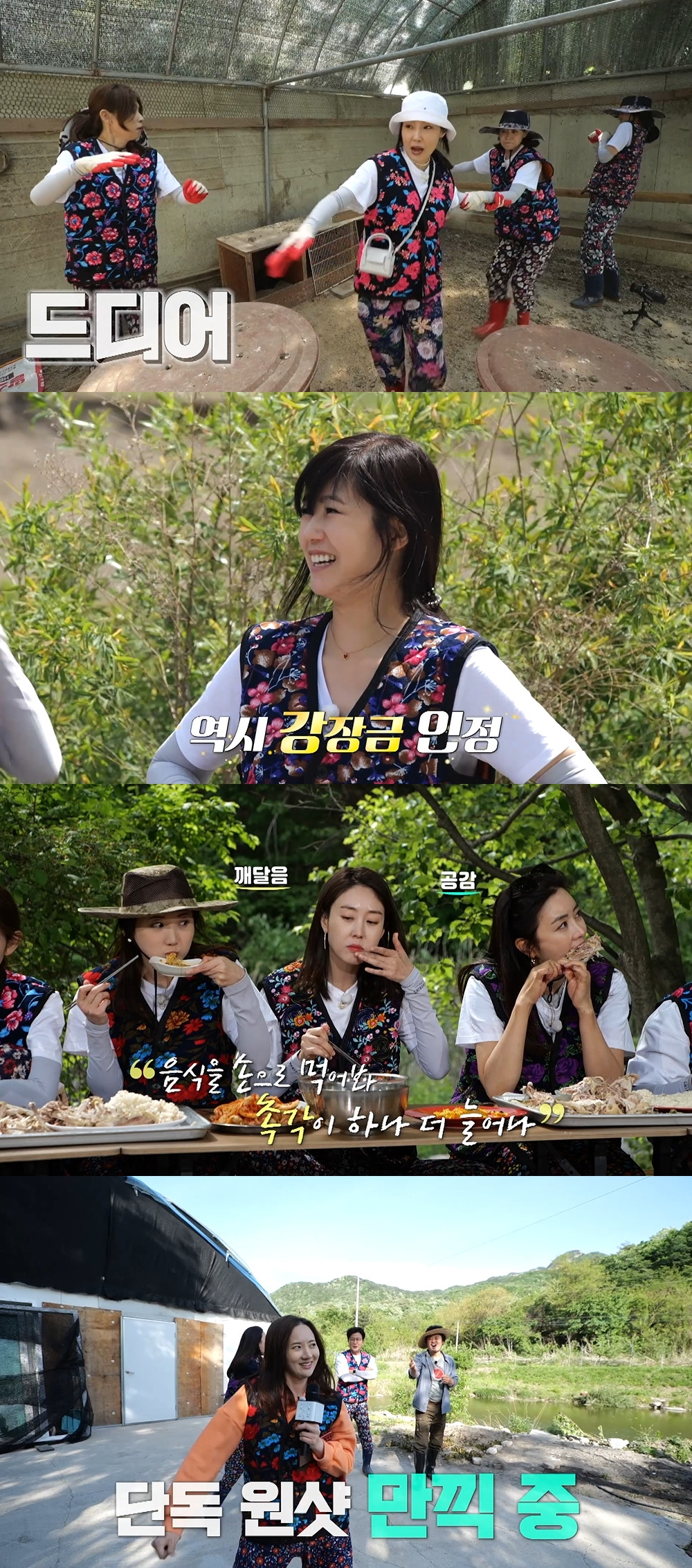 강수정은 첫 식사 준비에서 숨겨둔 요리 실력을 발휘했다. 그는 토종닭백숙과 각종 나물무침으로 김성주의 입맛을 사로잡으며 '강장금'에 등극했다. '아나즈'는 야외 먹방을 통해 원샷 전쟁을 벌이기도 했다. 미스코리아 본능을 놓지 못해 멤버들의 원성을 샀던 김주희는 '먹주희'로 인정받았다.